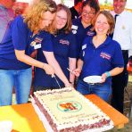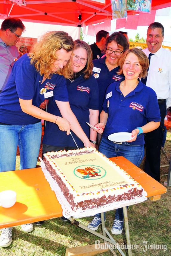 Pfarrerin Andrea Rudersdorf kam dem Wunsch der Betreuerinnen nach Segnung ihrer zukünftigen Aufgabe sehr gerne nach und nach dem gemeinsamen Foto durfte auch endlich die große Festtorte angeschnitten werden, die von der Bäckerei Lautenschläger gespendet worden war und das Logo der Löschfüchse zeigte.