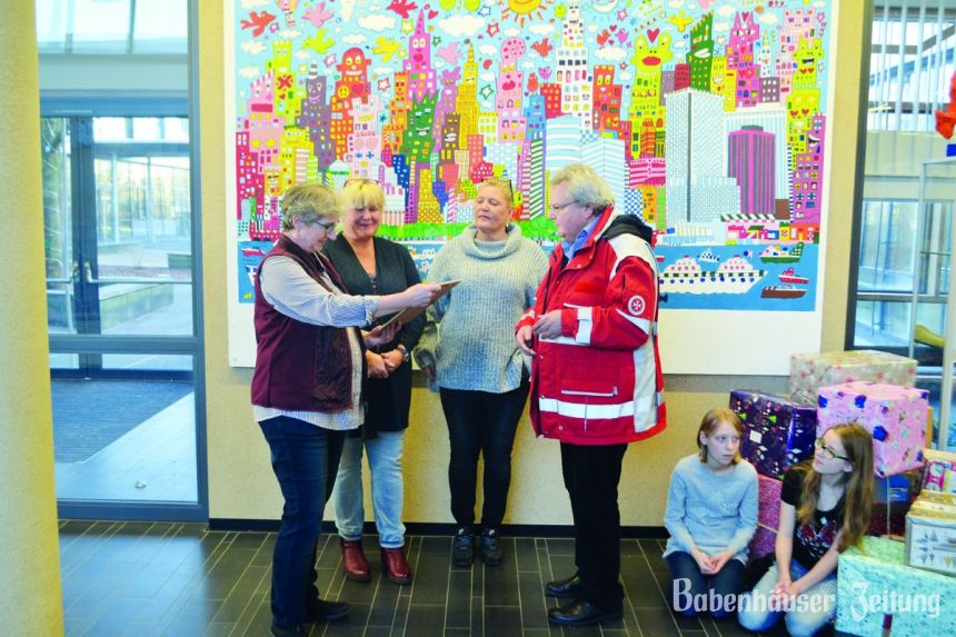 Die OSB beteiligt sich in diesem Jahr an der Weihnachtstrucker Aktion der Johanniter. Ursula Pullmann (stellv. Schulleiterin) und Klassenlehrerin Shirley Tieman (2. v.li.) bei der Übergabe.