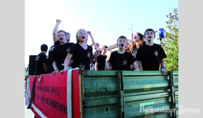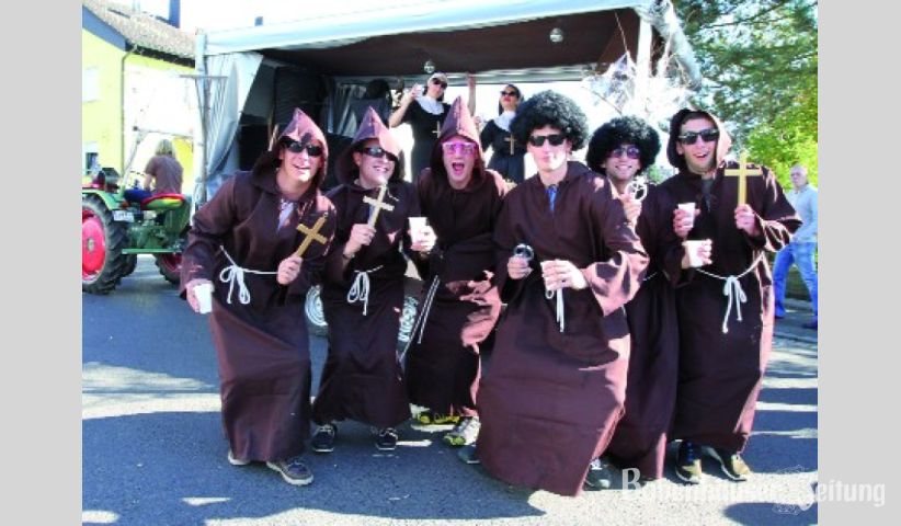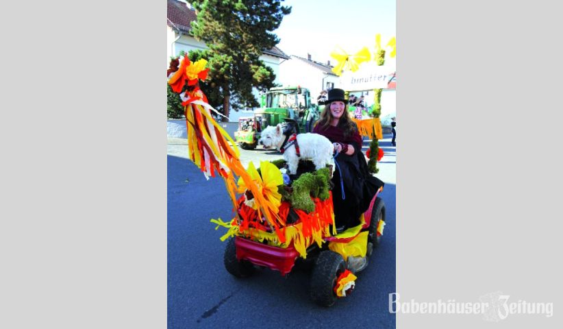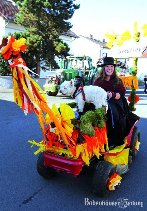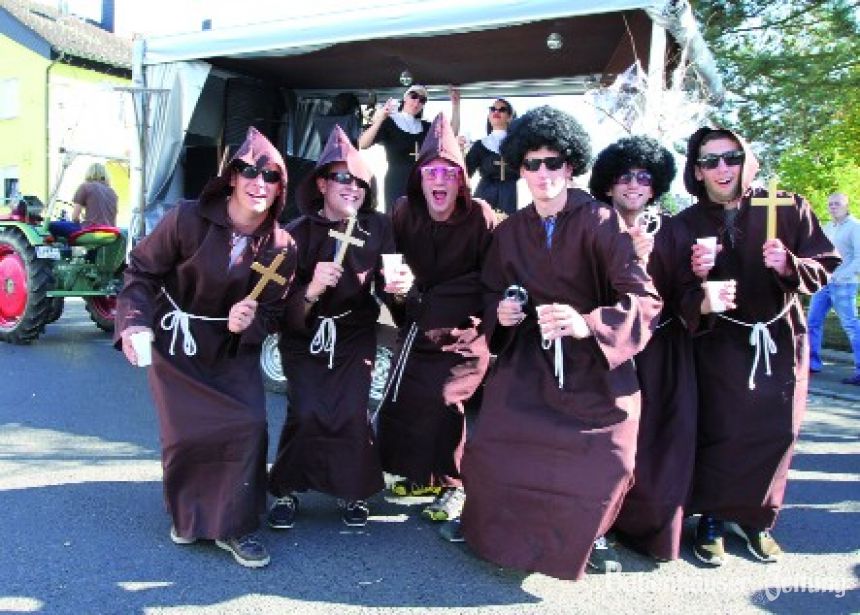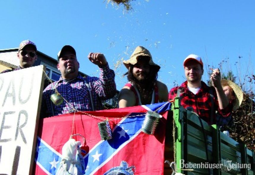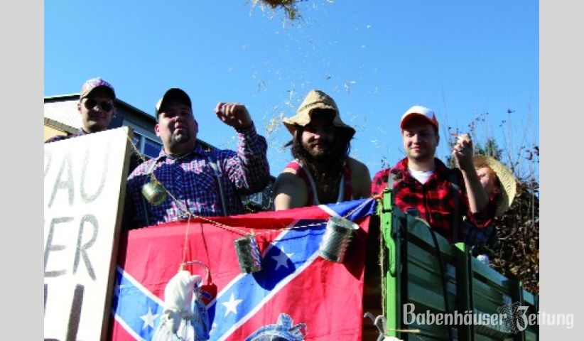 Kerbmutter Sabine Rauer tuckerte auf ihrem bunt und üppig geschmückten Sitzrasenmäher durch die Gassen, während die Gruppe „Als noch kaa Kerbburschen“ (ANKKB) als coole Hillbillys unterwegs waren. Der Kerbspruch im Bürgerhaus brachte so manches vergnügliche Ereignis aus dem Vorjahr nochmals zutage. Beim Rück-blick auf die Aktion „100 Kerbburschen“ anlässlich der 100-Jahr-Feier der „Kickers“ gab es tosenden Applaus, ebenso wie zur Geschichte vom übereifrigen Hergershäuser, der beim Anstreichen des Carports gleich das halbe Auto mit lackiert hatte.