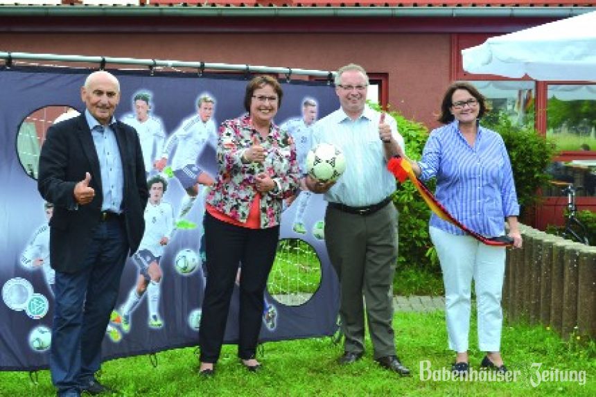 Bei der aufgestellten Torwand stellte CDU-Bürgermeisterkandidat Rüdiger Manowski seine Treffsicherheit unter Beweis und erzielte das erste Tor des Tages.